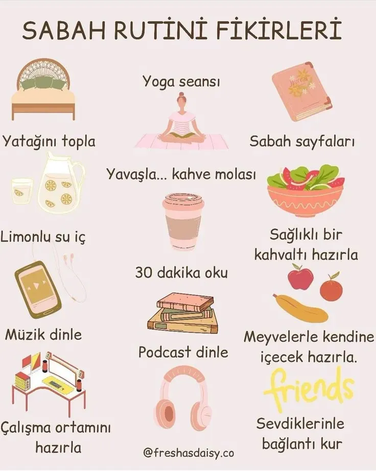 | İlgili Anahtar Kelimeler | Sabah rutini; Kahvaltı önerileri; Su tüketimi; Kısa egzersizler; Günlük ritüeller |